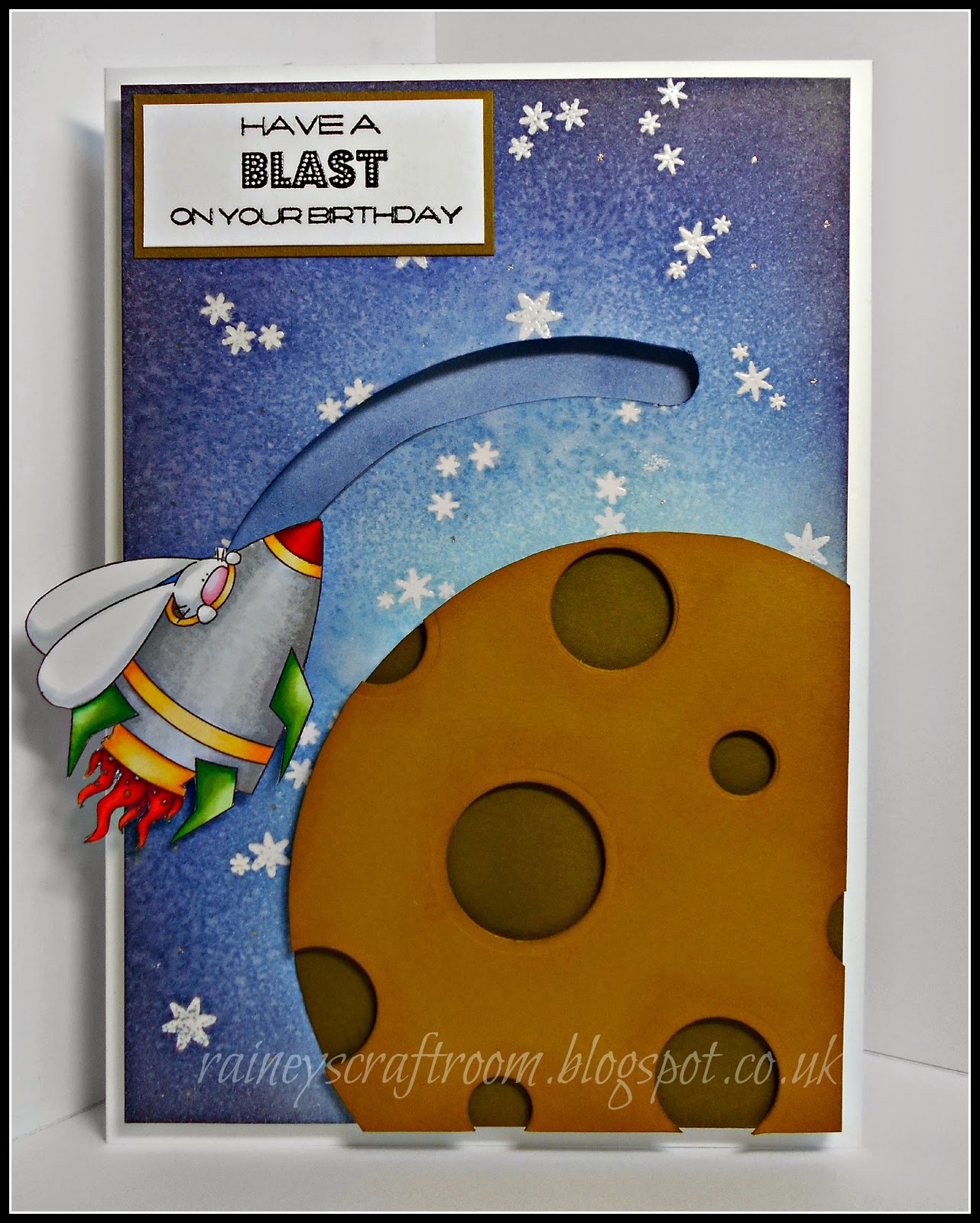 This was such a fun card to make and I loved colouring the little bunny image. I started by stamping random stars over the plain top card layer with clear embossing ink and heat embossed them. Than I inked the sky with Distress Inks, the embossed stars resist the ink and stay white and glossy. Then I spritzed with a water mister to create an outer space look. The planet was created using two different toned pieces of cardstock cut in to circles and using smaller circle dies I randomly cut out the craters and popped it up on foam tape. My image was coloured using my Pro/flexmarkers and attached to one penny with a foam circle. Another foam circle was sandwiched between that and the other penny making the slider mechanism. The tricky part was cutting the curved slot in the top layer of card, I made myself a template first as I didn't want to mess it up at this stage. Once the slot was made then the penny sandwich was inserted and the Rocket now slides and spins along the slot looking like Bunny is whizzing around the planet. That just left the sentiment and I had the perfect one from Clearly Besotted Stamps.